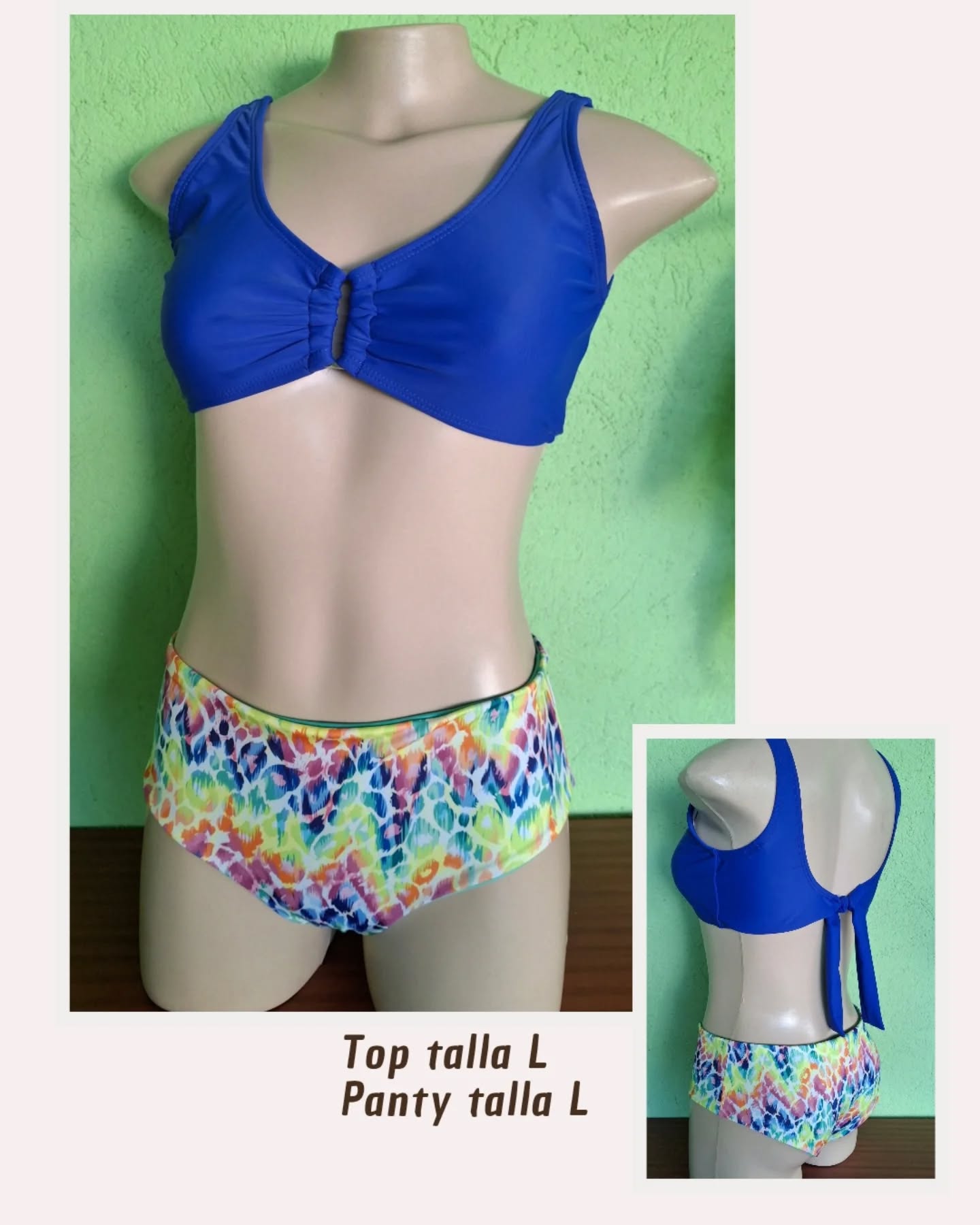 El conjunto Olas Eléctricas combina la energía del color azul royal con un panty multicolor vibrante que transmite frescura y movimiento.